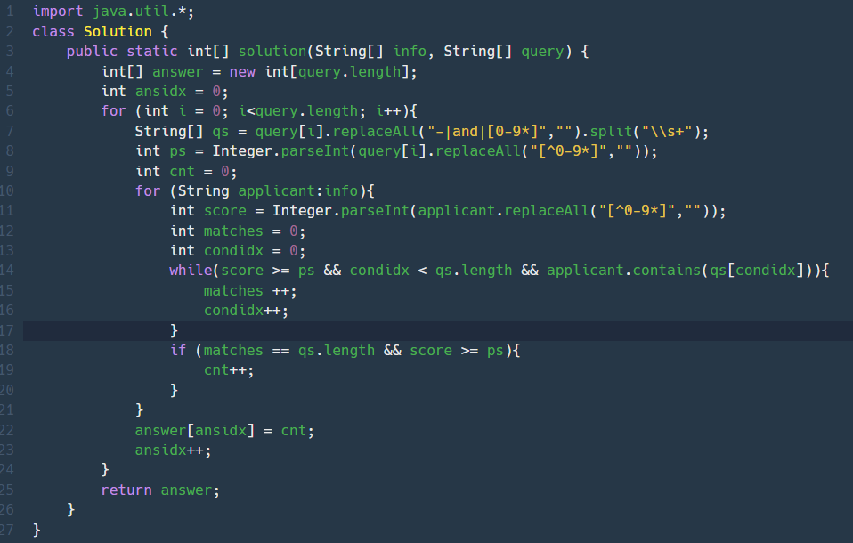 기존 코드 문제 : 쿼리가 어떤 순서로 들어오는지 모른다고 생각을 해서, 쿼리를 split으로 나누고, 각 조건마다 for문을 돌면서 info가 그 조건을 contain하는지 확인했다. 또한, 이 작업을 info의 모든 element에 대해 해야해서 시간이 굉장히 많이 걸렸다.