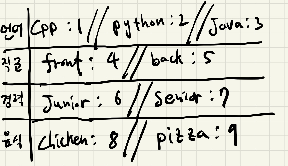 각 조건마다 1~9의 숫자 string을 주어 조건들의 조합으로 key를 생성하였다.