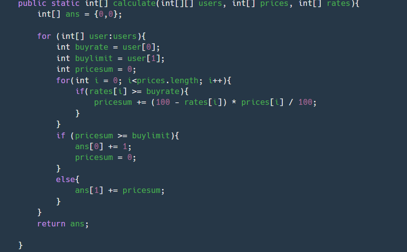 int[] infos = calculate(users, prices, rates);