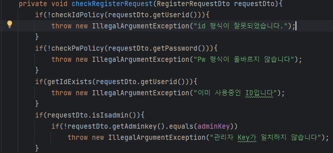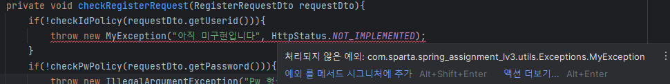 이를 해결하기 위해서는 메서드 뒤에 throws MyException을 붙여야하는데, 현재 checkRegisterRequest에 이를 붙이면