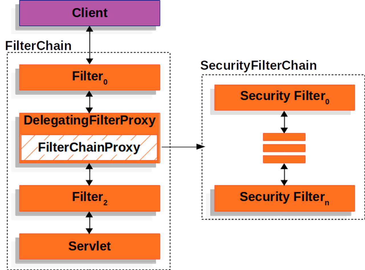 Filter는 보안검사를 통해 올바른 요청이 아닐경우 차단. 이러한 Filter들의 연속을 Filter chain이라고 한다.